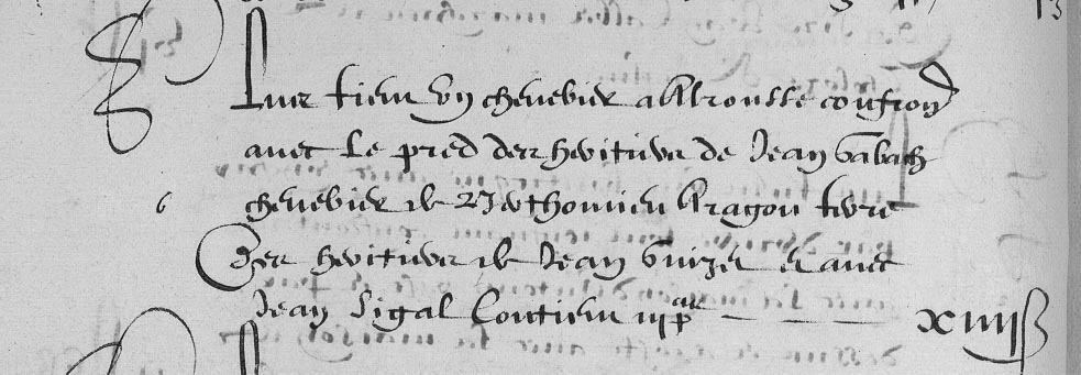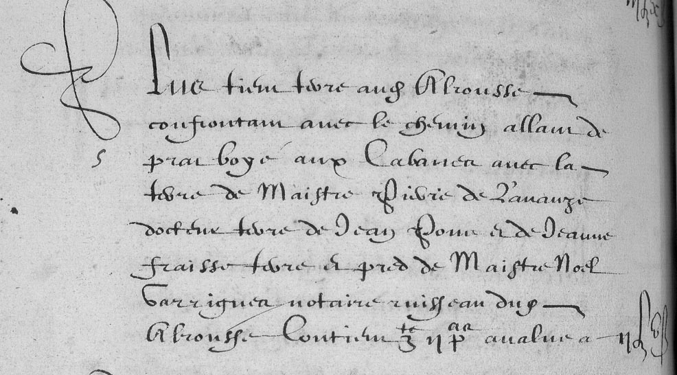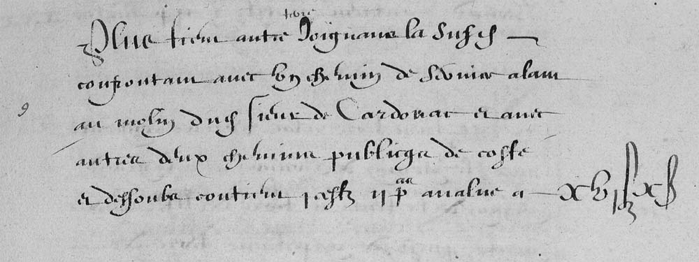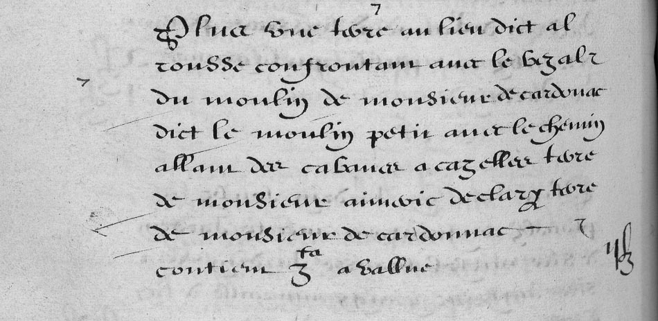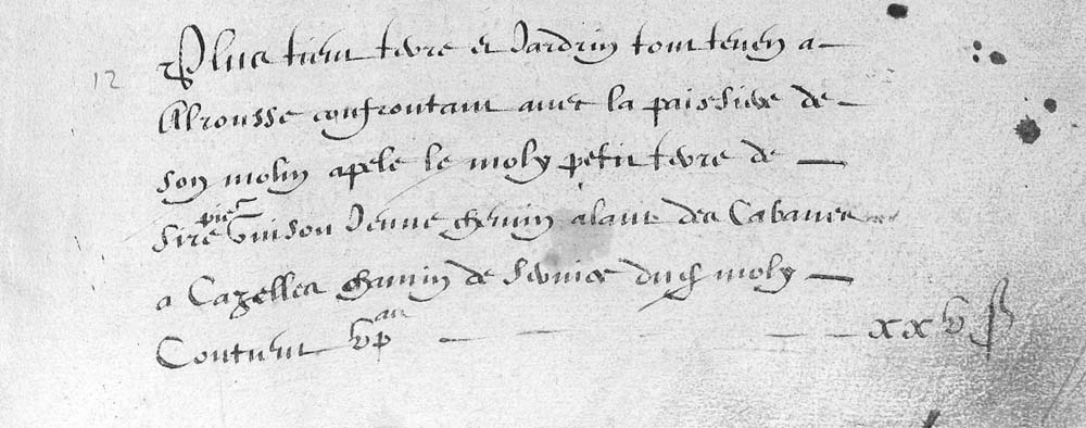 | 12 | Plus tien terre et jardin tous tenen a Alrousse confrontan avec la paissiere de son molin apele le moly peti? terre de Sire Pier Guison Jeune chemin alam des Cabanes a Cazelles chemin de Service dudit moly contien V Pas - - - - - - - - - - - - - - -XXVB |