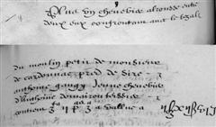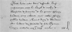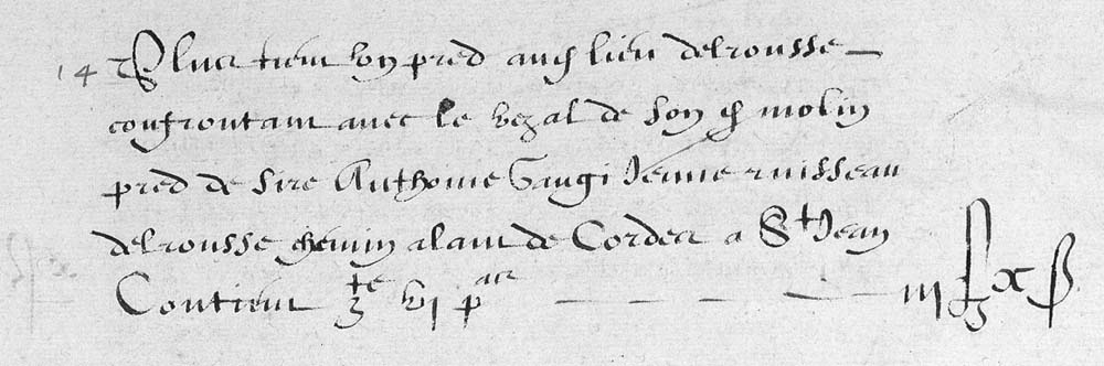 | 14 | Plus tiem un pred audit lieu delrousse confrontan avec le vesal canal d'amenée d'eau, rigole d'arrosage de son dit molin pred de Sire Antoine Gaugi jeune ruisseau delrousse chemin alam de Cordes a St Jean contien Zte VI Pas - - - III£ XB |