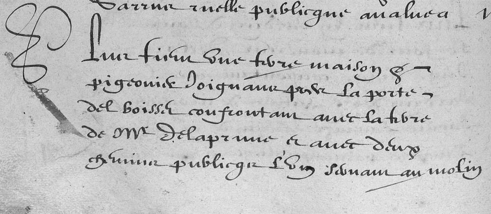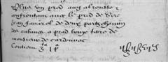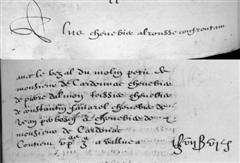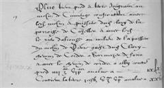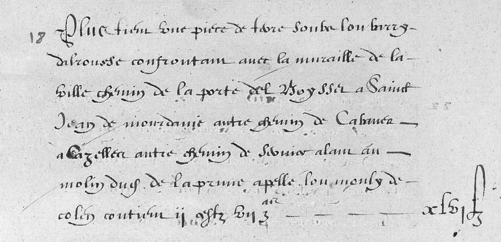 | 18 | Plus tiem une piece de terre soubs lou barryNom d'origine Arabe. Faubourg situé hors de l'enceinte d'une ville fortifiée. À Cordes, c'est le quartier situé au-dessus du Moulin dalrousse confrontan avec la muraille de la ville chemin de la porte del Boysset a Saint Jean de mourdanie antre chemin de Cabannes a Cazelles antre chemin de service alam au molin dudit de la prunne apellé lou mouly de colen Bingo!!! C'est donc le Moulin à Tonton! contien II ?stz VII Zas - - - - X?VI£ |