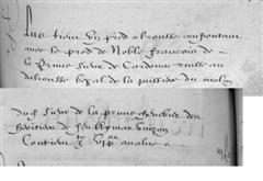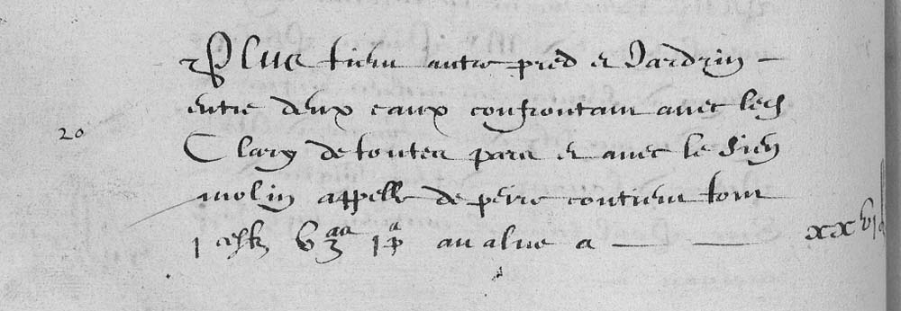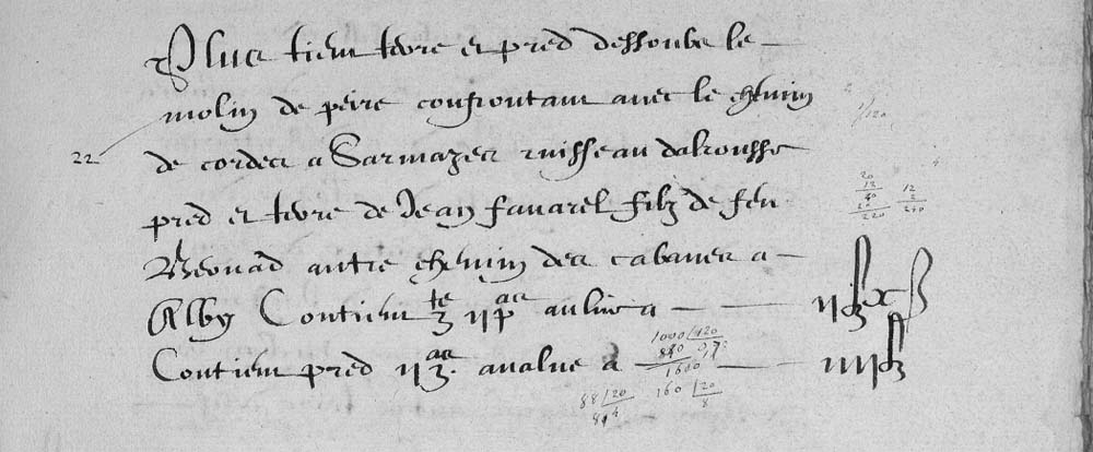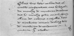 | 20 | Plus tien un molin a alrousse apelé lou moly colen confrontan avec le chenevier pred et terre dudit Sieur de cardonac de toutes parts avalue a LX£ |