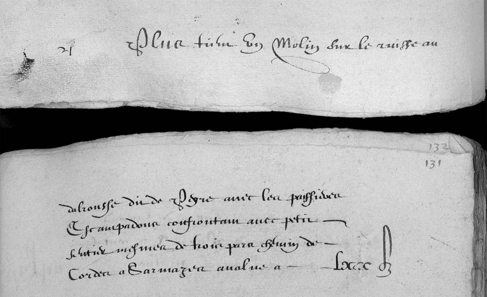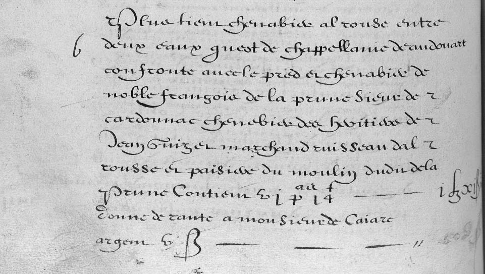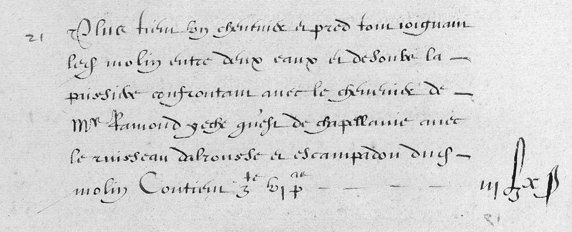 | 21 | Plus tien un chenevier et pred tous ioignam ledit molin entre deux eaux et desoubs la paissiere confrontan avec le chenevier de Mr Ramond yeche qu'est de chapellanie avec le rouisseau dalrousse et escampadou dudit molin contien Zte VI Pas - - - III£ XB |
