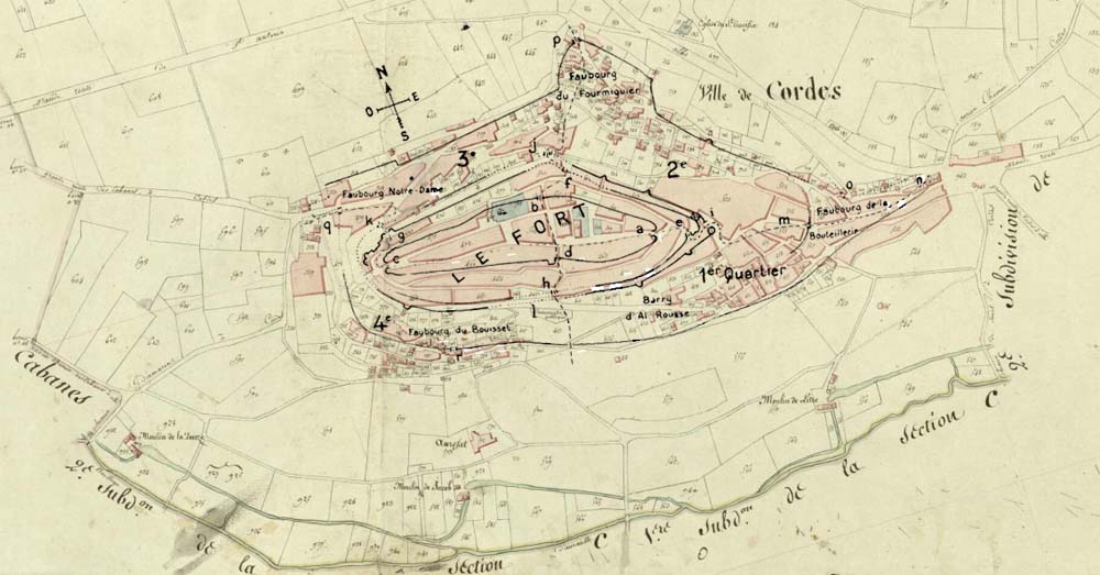 La superposition du plan des quartiers de la Ville de Charles Portal sur le cadastre Napoléon permet de mieux apprécier les indications du compoix, nottament pour le "barry d'Alrousse", et le petit "h" qui est la porte du "Boysset" aujourd'hui disparue.