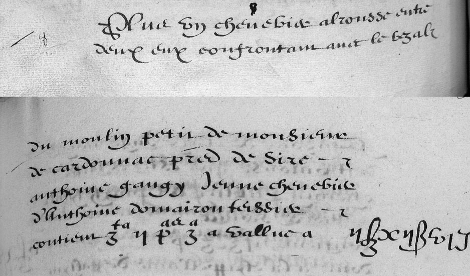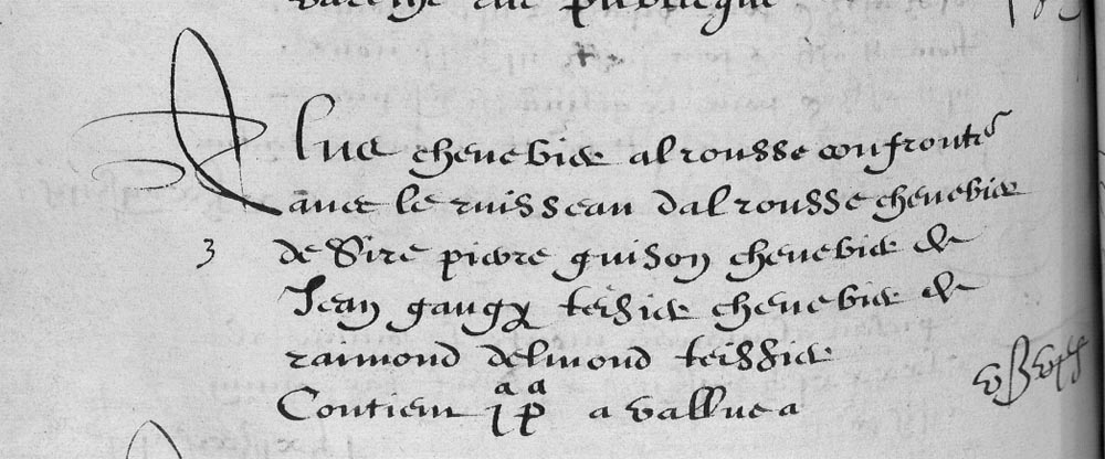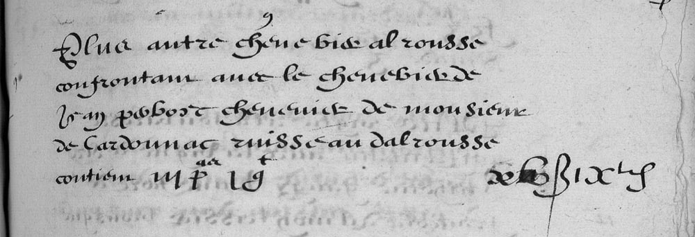 | 15 | Pluls tiem un chenevier a alrousse confrontan avec le chenevier de Michel Roque chenevier de Sire Pierre ????? ????? paissieyre et escampadou dudit Molin petis dudit Sieur de Carconnac Ruisseau dalrousse contiom Zte Za +a - - II£ IIB VID |