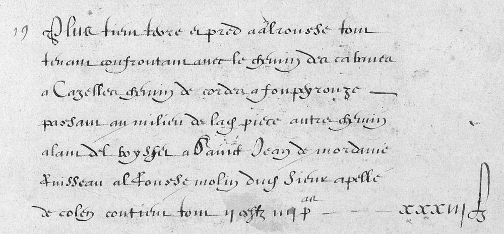 | 19 | Plus tien terre et pred a alrousse tous tenan confrontan avec le chemin des cabanes a Cazelles chemin de cordes a fonpeyrouze passam au milieu de ladite piece antre chemin alam del boysset a Saint Jean de mordanie Ruisseau al Rousse molin dudit Sieur apellé de colen contien tous II ?stz IIII Pas - - - XXXIII£ |