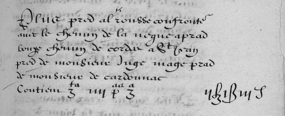 | 15 | Plus pred al rousse confrontan avec le chemin de la neque a prad bouye chemin de cordes a St Jean pred de monsieur Juge mage prad de monsieur de cardonnac Contien Zta IIII Pas Za - - - - II£ Iβ IIIIδ |